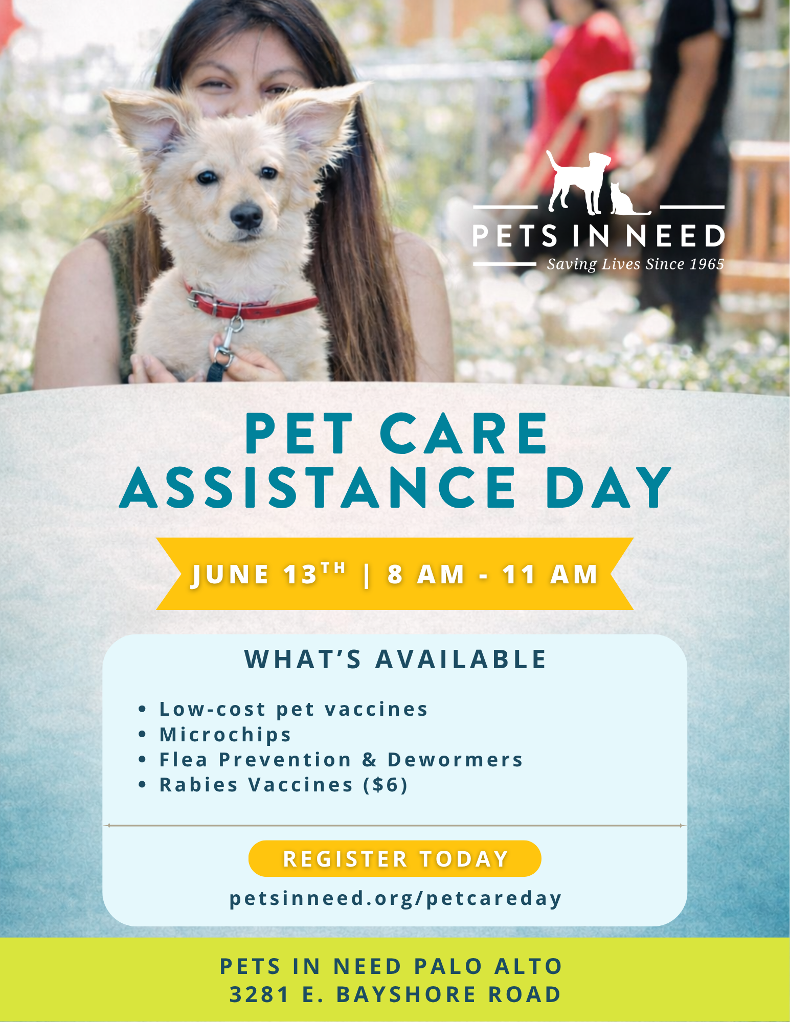 Pets In Need is proud to host our annual Pet Care Assistance Day, a community-focused event offering low-cost vaccines, microchips, flea prevention, dewormers, and pet supplies to local families in need on Saturday, June 13, 2026.